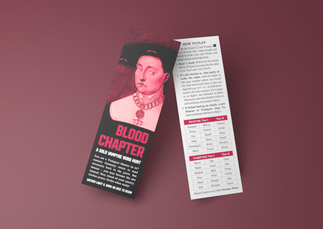 Written, augmented, purged, and published by Exeunt Press. Blood Chapter is copyright 2025 Exeunt Press and may not be reproduced without permission. Uses the Dicier font by Speak the Sky (CC-BY-4.0).