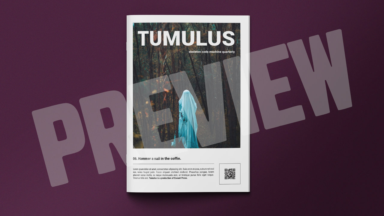 TUMULUS is a quarterly compendium of analog gaming inspiration, tools, design theory, and playable content from the award-winning Skeleton Code Machine. Cover of Issue 6 is a preview as shown and not final. Subject to change.