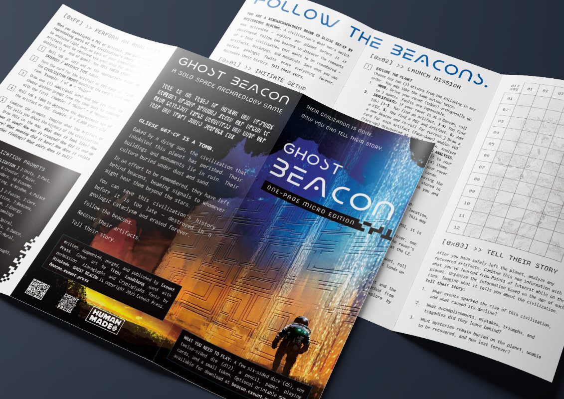 Written, augmented, purged, and published by Exeunt Press. Cover art by Tithi Luadthong used with permission. Aloraglyphs and Cryptaglyphs fonts by Hinokodo. Ghost Beacon is copyright 2025 Exeunt Press.