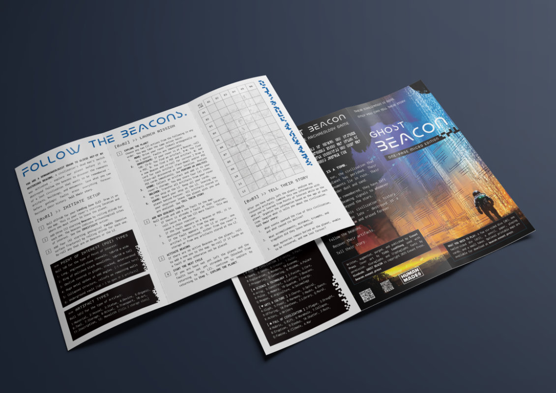 | Tags | alien, archaeology, history, journaling, No AI, One-page, one-page-rpg, Solo RPG, Space, Tabletop role-playing game |